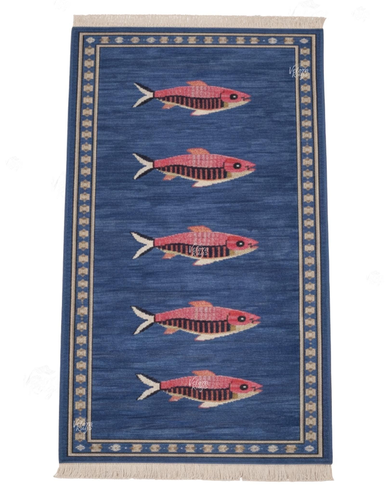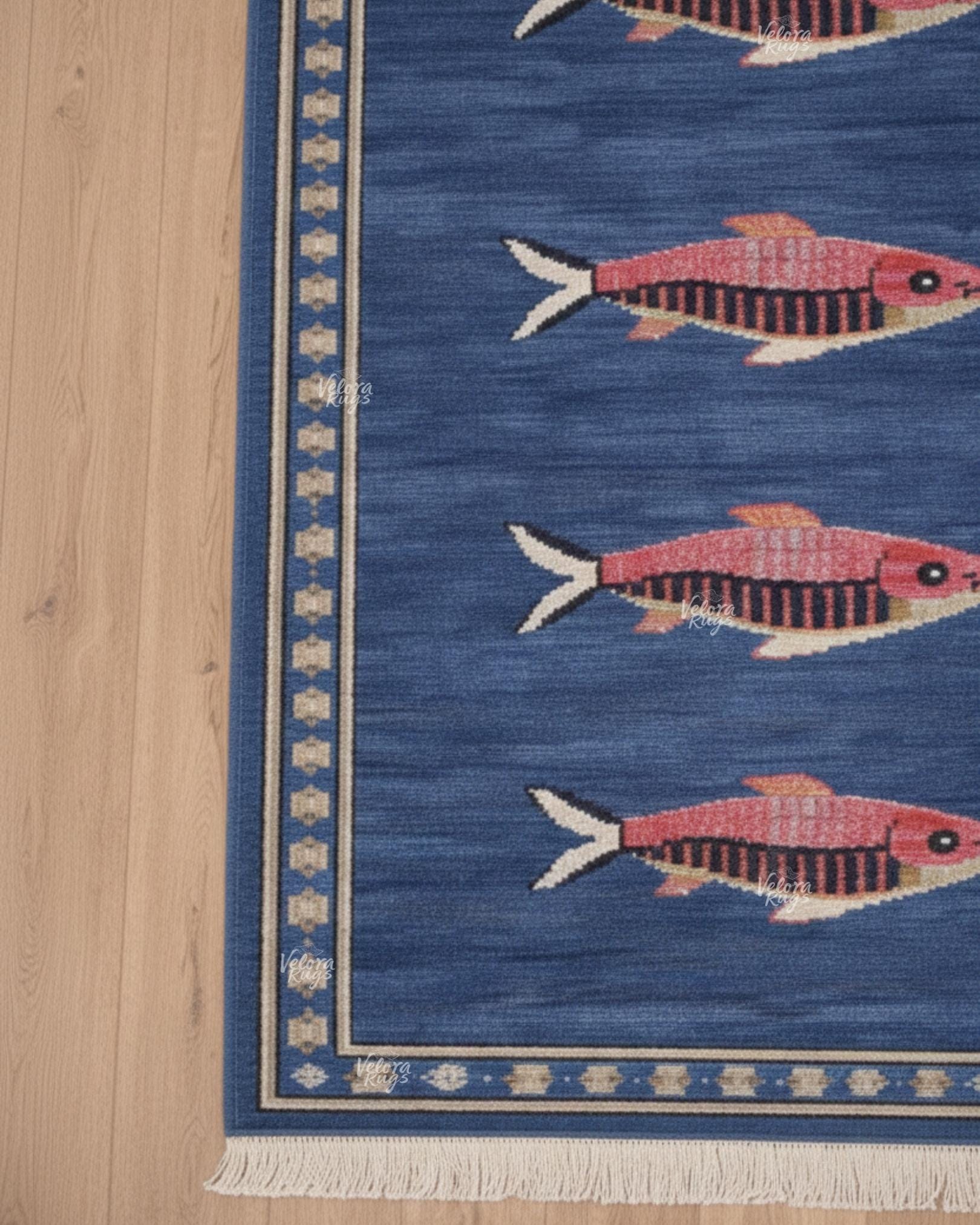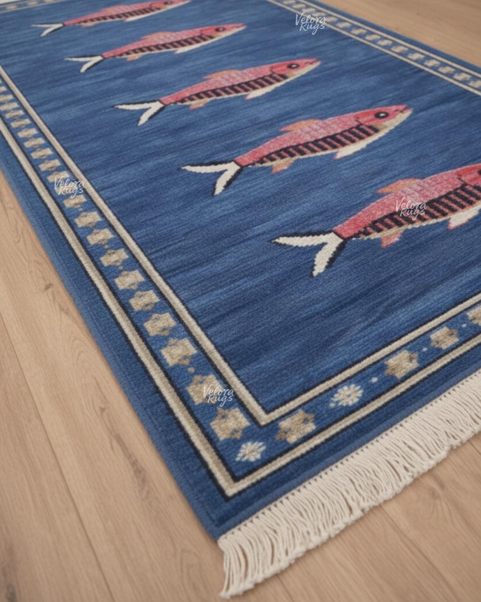 Fish Pattern Hand Knotted Runner Rug | Blue Nautical Wool Rug for Kitchen & Hallway | Coastal Handmade Carpet